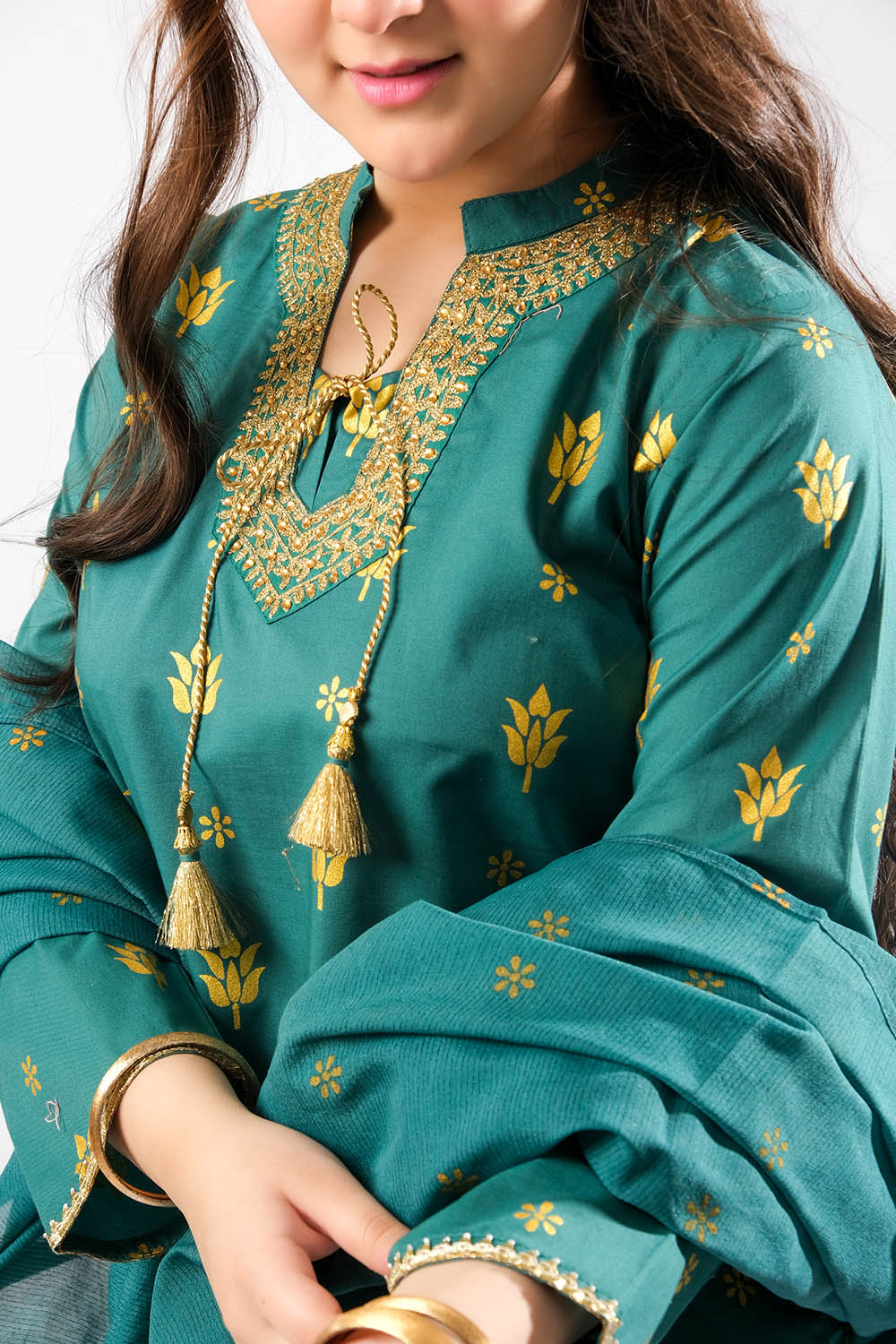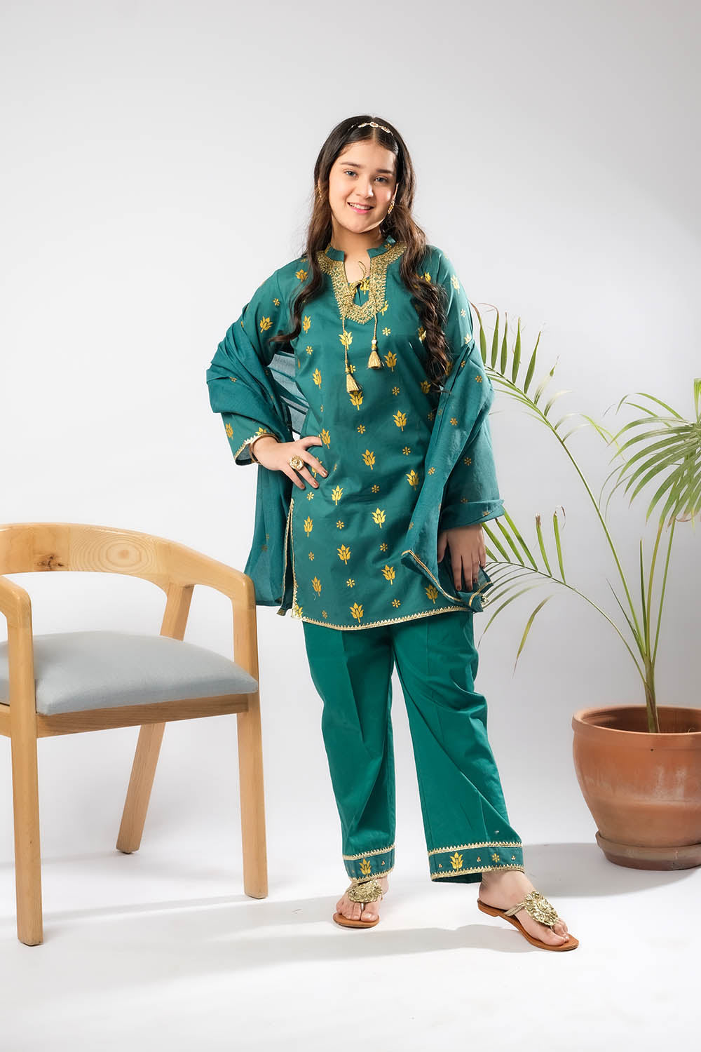 Girls Eid Dress | Green & Gold | Casual Plus 3 Piece Suit | Cotton Glitter Printed | GBD-03392