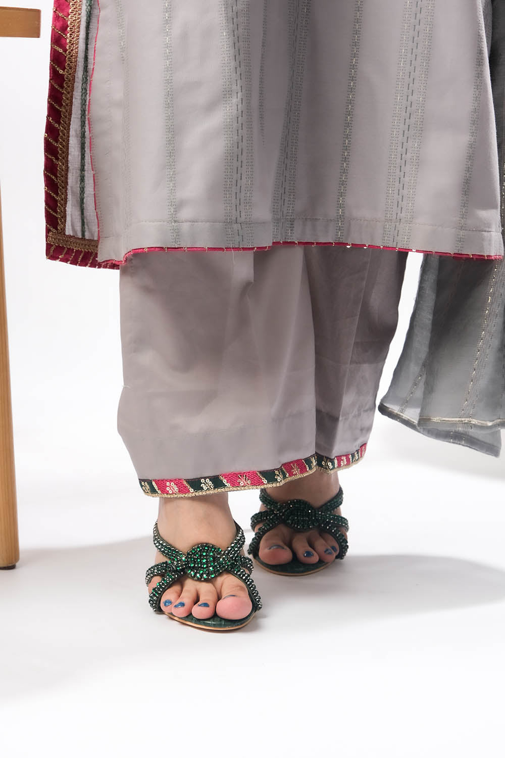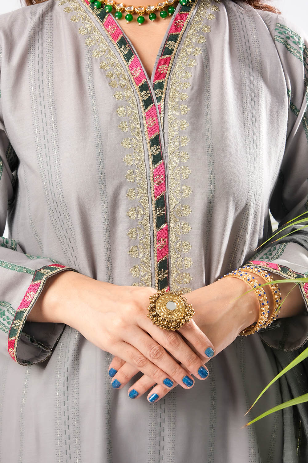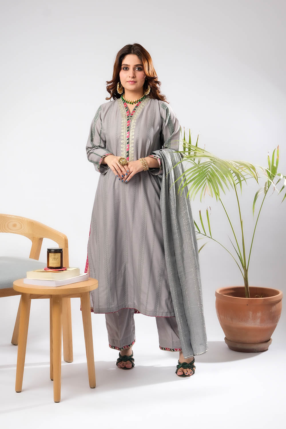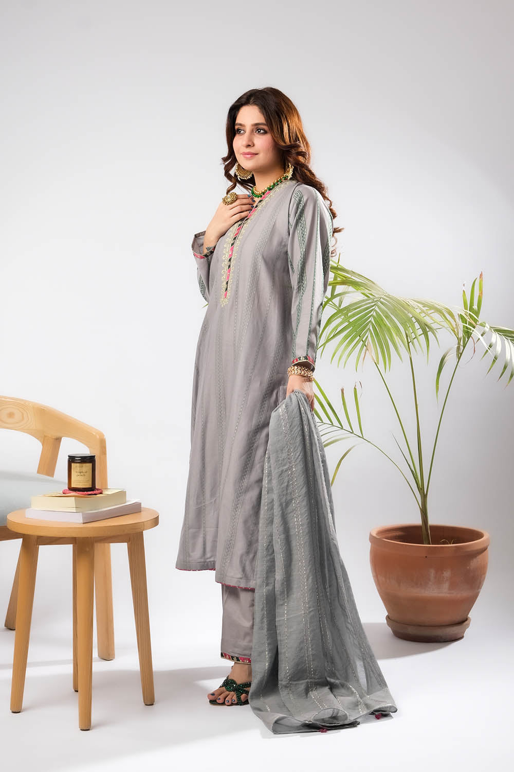 Women Eid Dress | Grey & Multicolor | Casual Plus 3 Piece Suit | Cotton Dobby Gold | LBD-03401