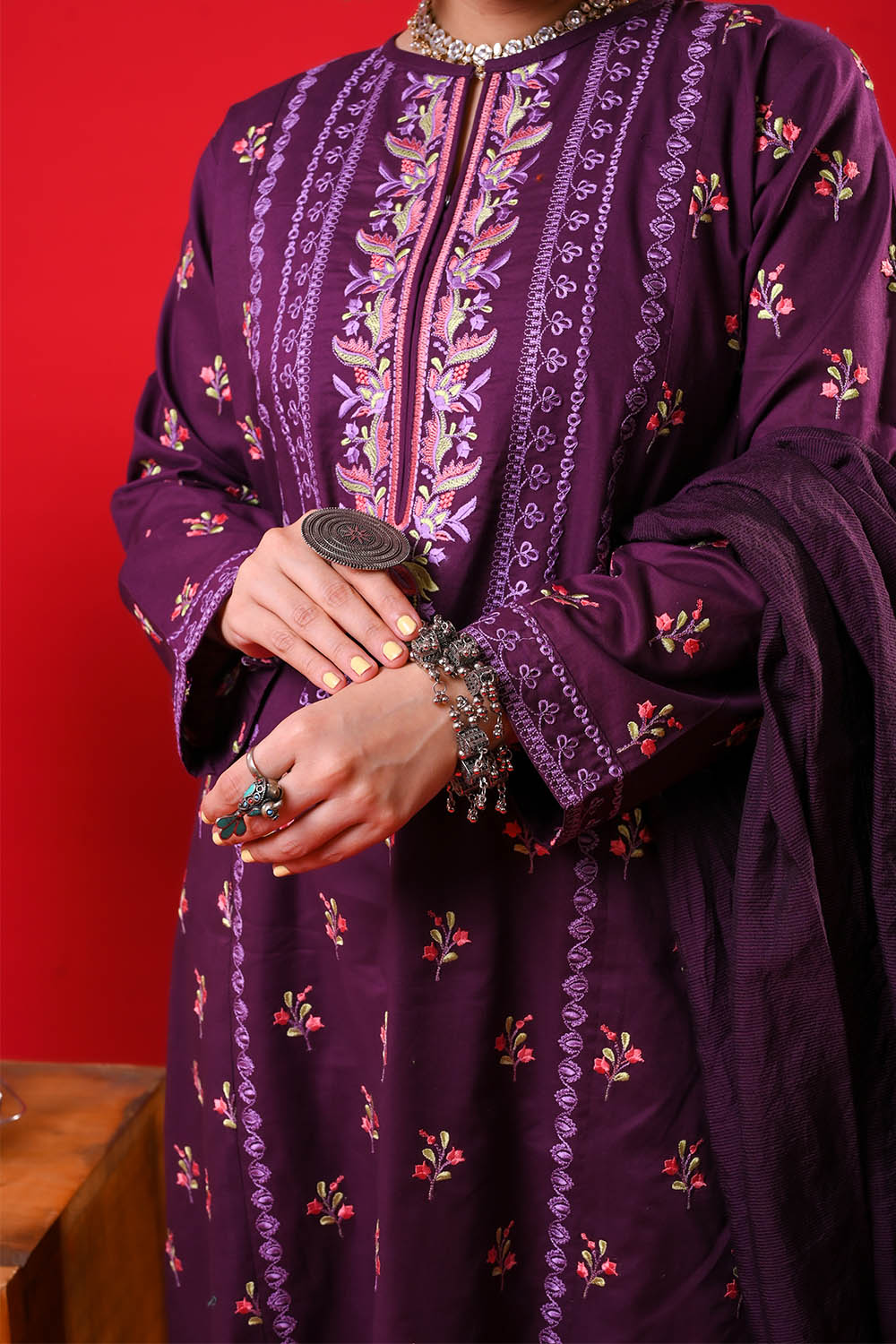 "A graceful Women Eid Dress featuring an all-over embroidered panelled shirt, paired with elegantly loose-cut pants and a matching dupatta.