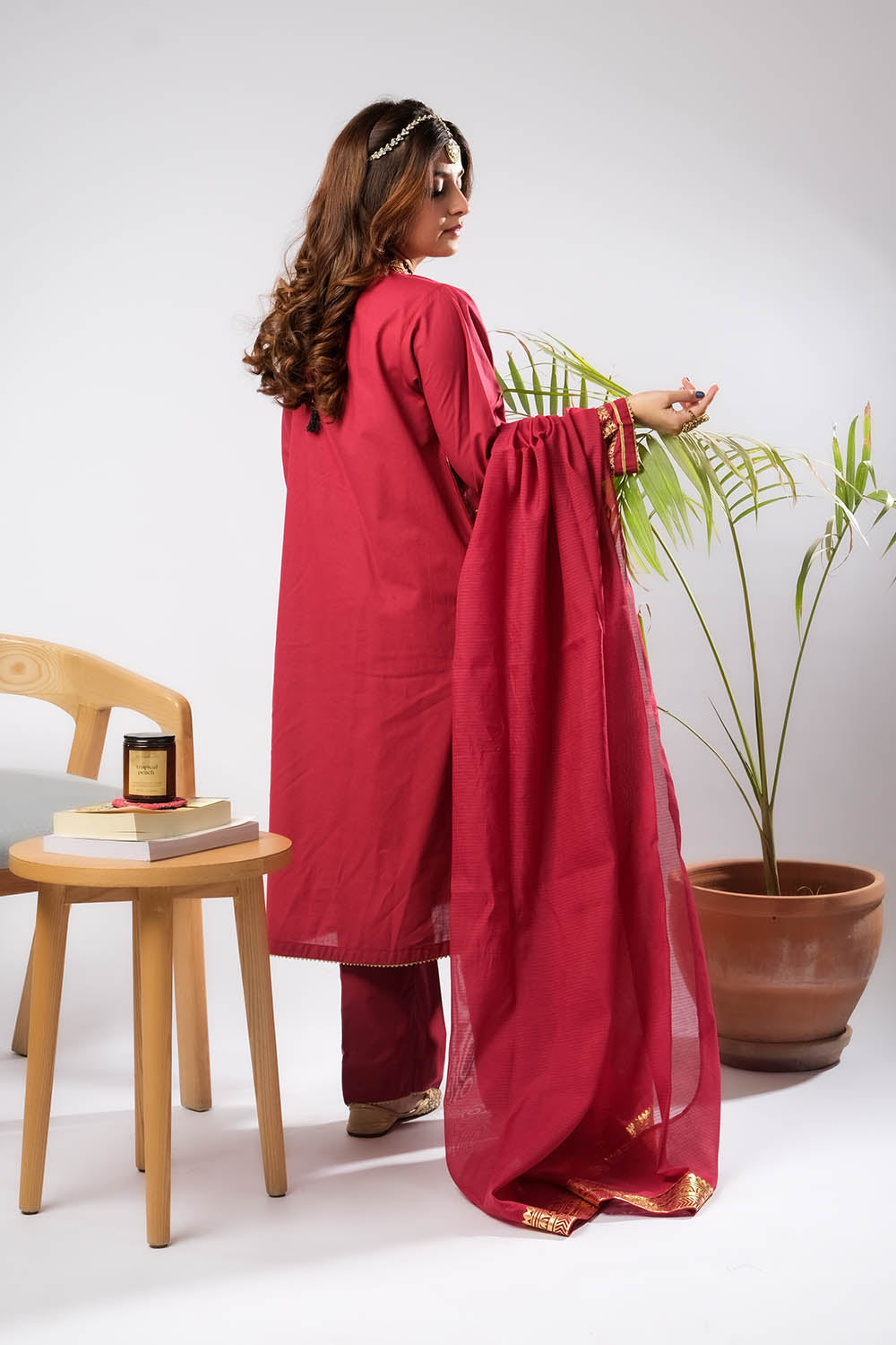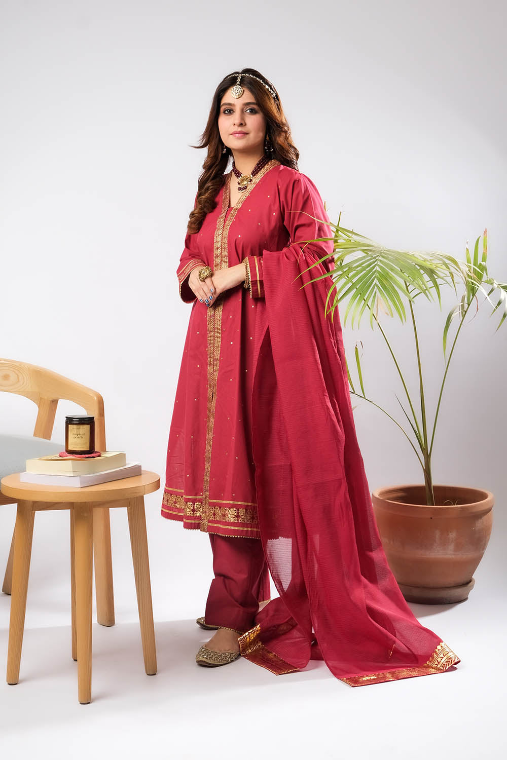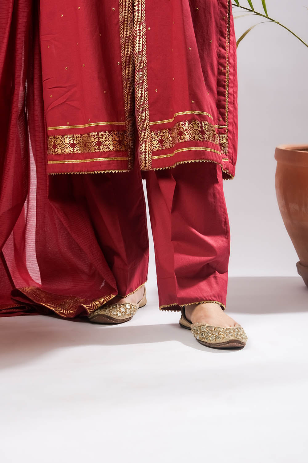 Women Eid Dress | Maroon & Gold | Casual Plus 3 Piece Suit | Cotton Foil Printed | LBD-03394
