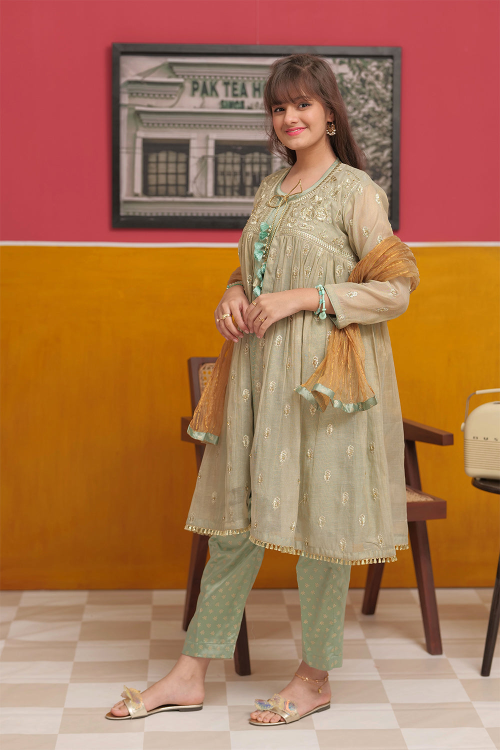 Girls formal clothes | Green & Gold | Formal 3 Piece Suit | Banarsi Masuri Fabric | GDD-03186