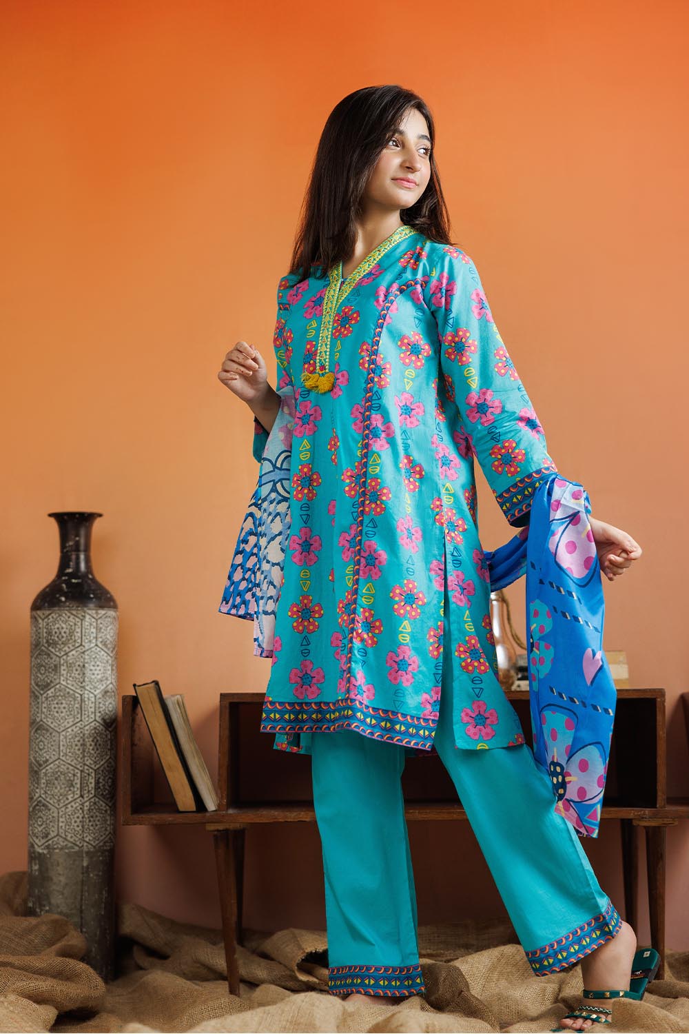 Panelled shirt with embroidery around necklne embellished with handmade tassel paired with loose cut pants and printed duppatta.