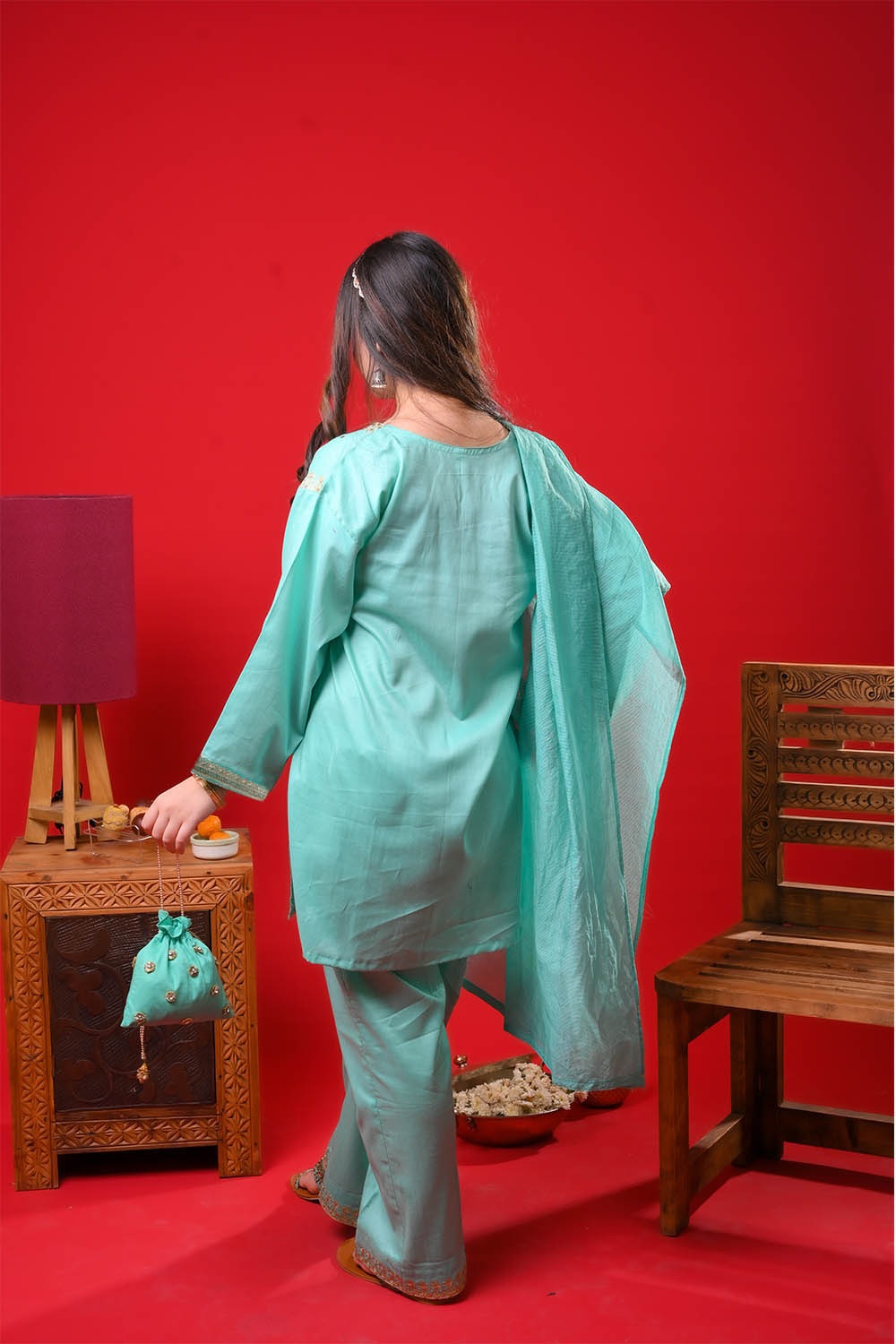 Girls Eid Dress | Sea Green & Gold | Casual Plus 3 Piece Suit | Cotton Self Dobby | GBD-03373