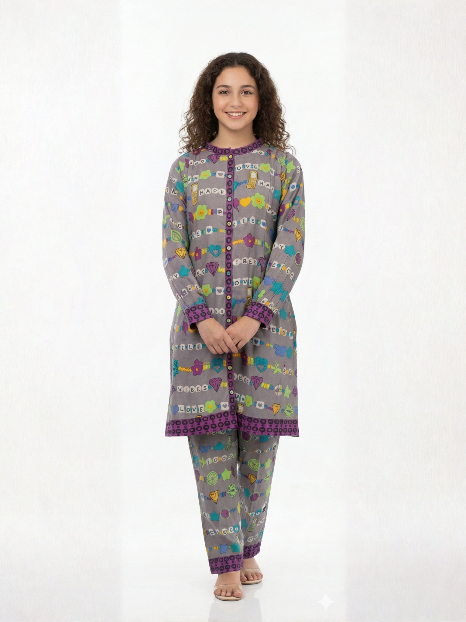 Girls Summer Clothes | Grey & Multicolor | Casual 2 Piece Suit | Cotton Lawn Printed | GAC-03123