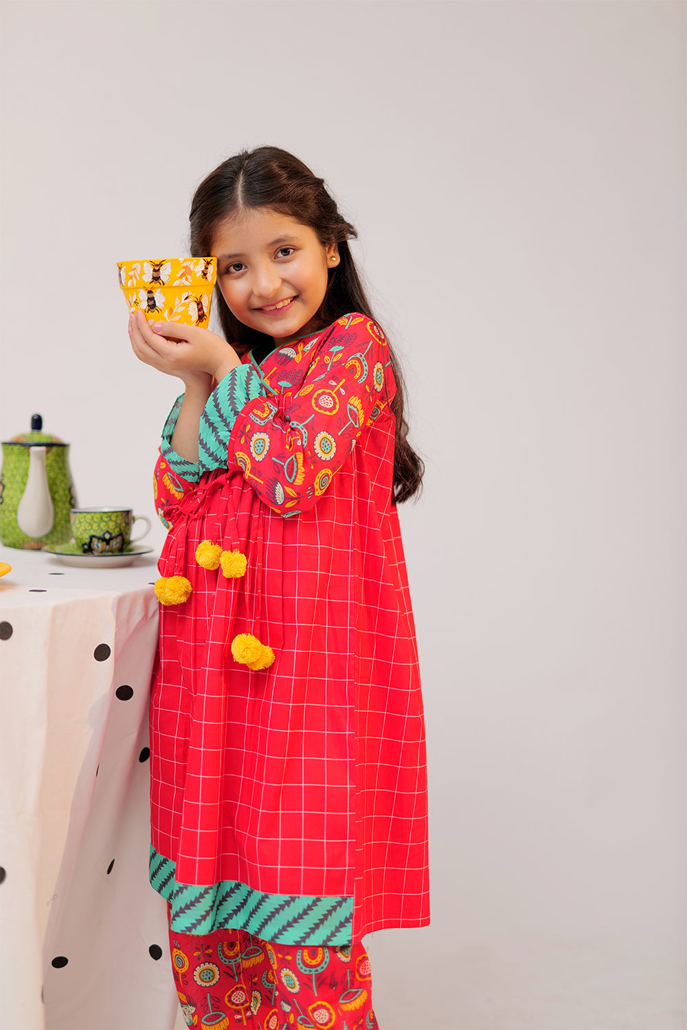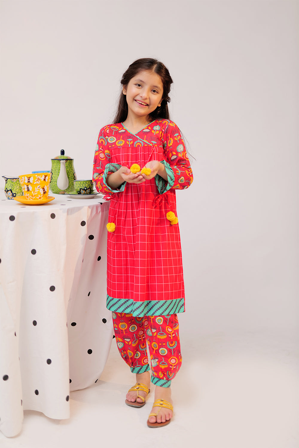 Angarkha style body frock with pleats on front and back, having straight full sleeves, finished with contrasting border on sleeves, daaman, and bottoms. Embellished with pom pom dori. Paired with pleated stylized pants.