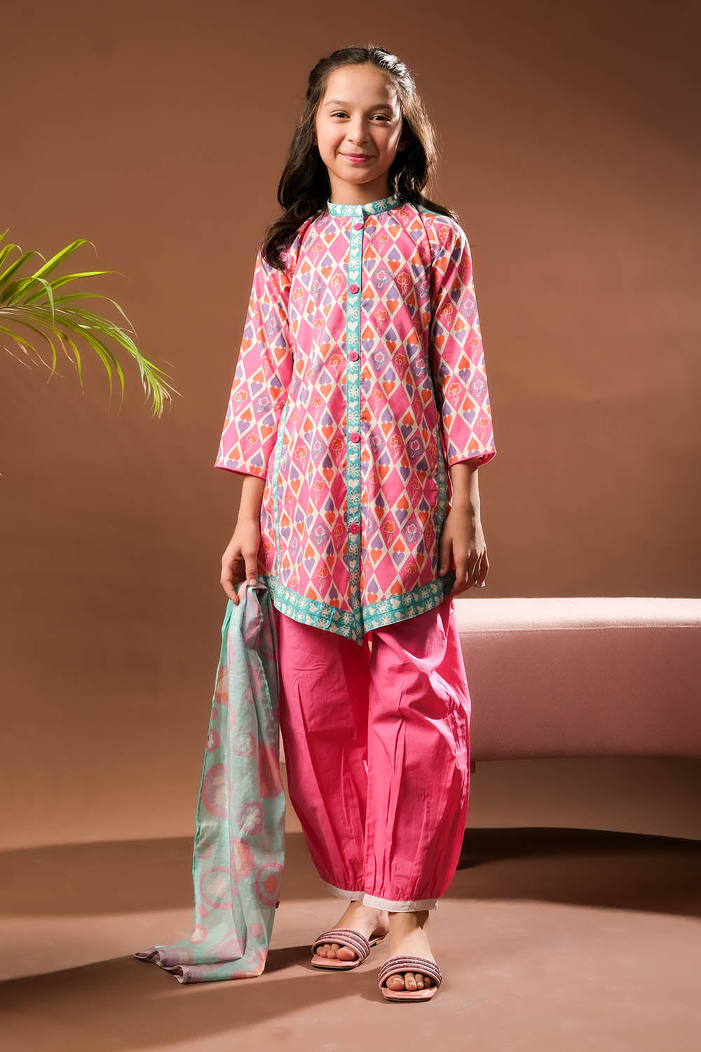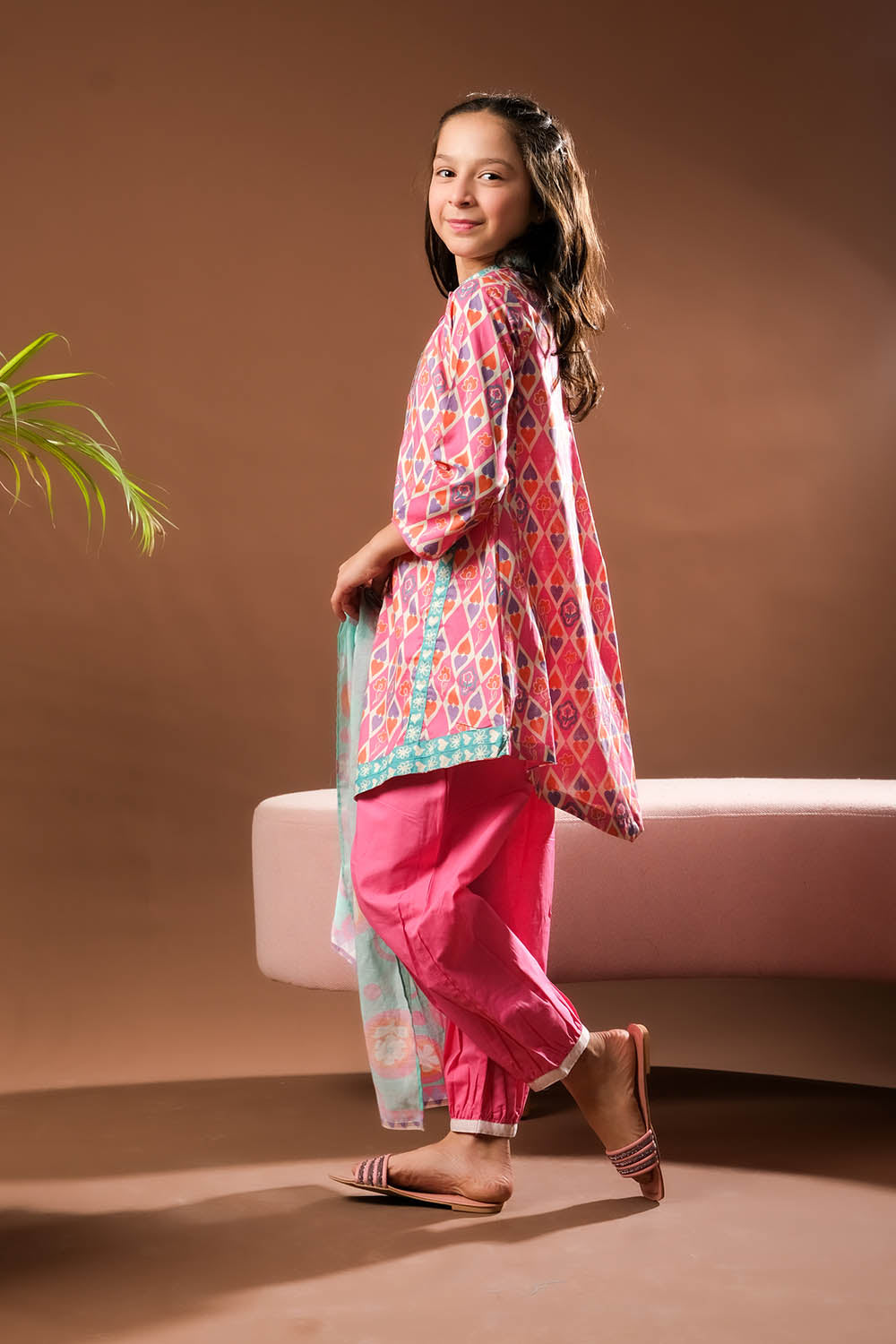 Kids Eid Dress | Pink & Multicolor | Casual 3 Piece Suit | Cotton Lawn Printed | KAD-03335