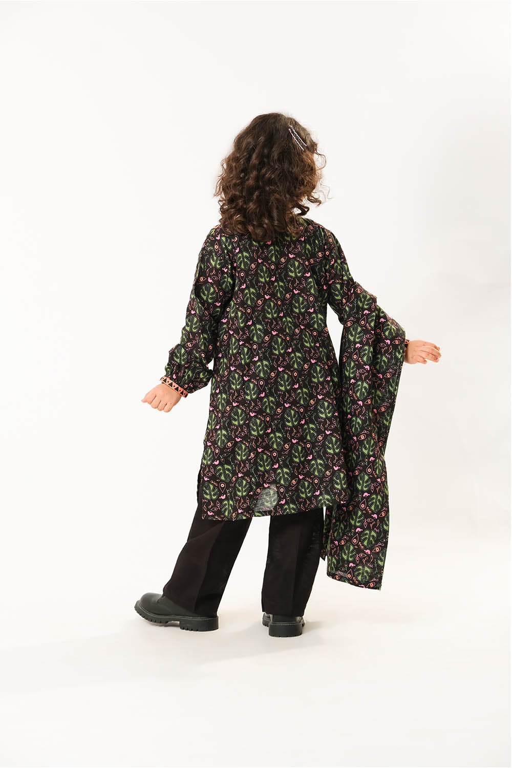 "Stylish kids winter outfit featuring an A-line shirt with a contrast printed border on the neckline and tassel embellishments for a chic touch.Paired with trendy pants and dupatta, making it a perfect choice for casual and semi-formal winter wear."