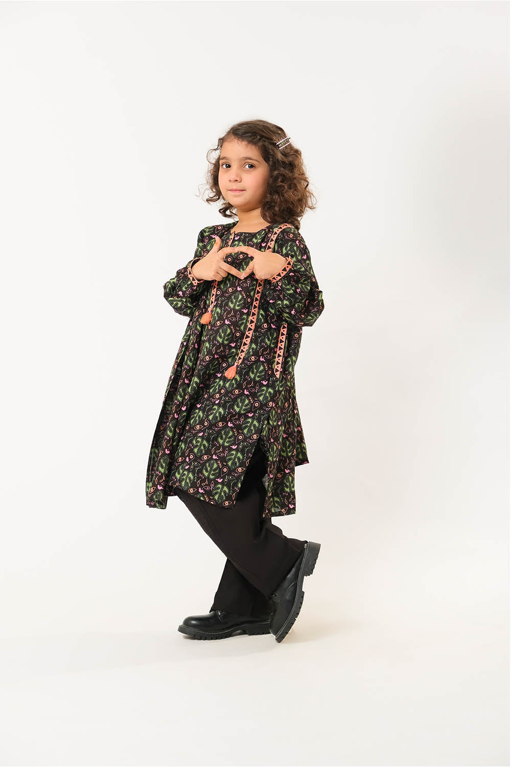 "Stylish kids winter outfit featuring an A-line shirt with a contrast printed border on the neckline and tassel embellishments for a chic touch.
